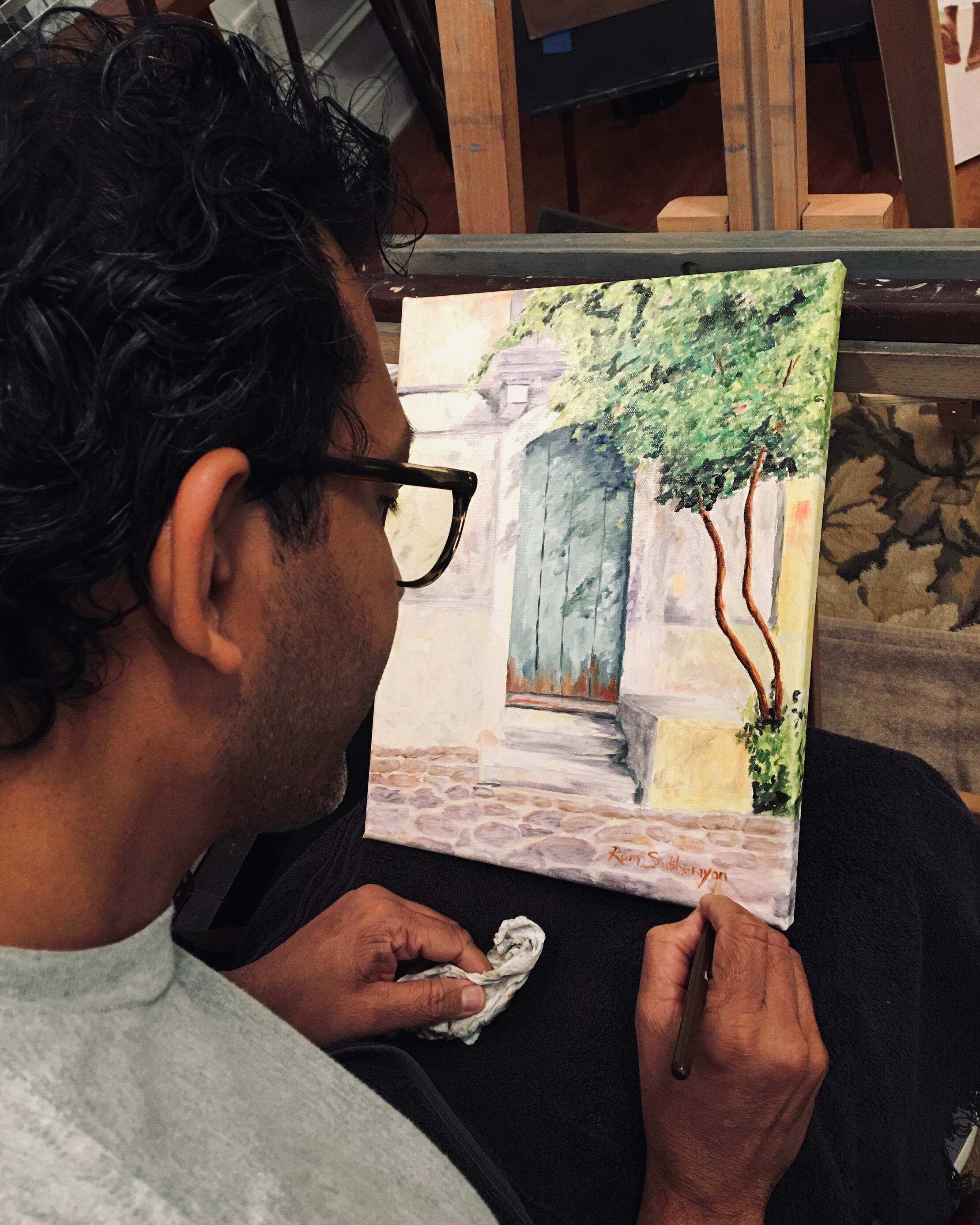 After a long break while pursuing his professional career, Ram returned to painting as a creative outlet, experimenting with acrylics after moving to the United States in 2011. In 2023, he began studying art more intentionally, working with oil pastels and oil paints and refining his technique through formal classes.