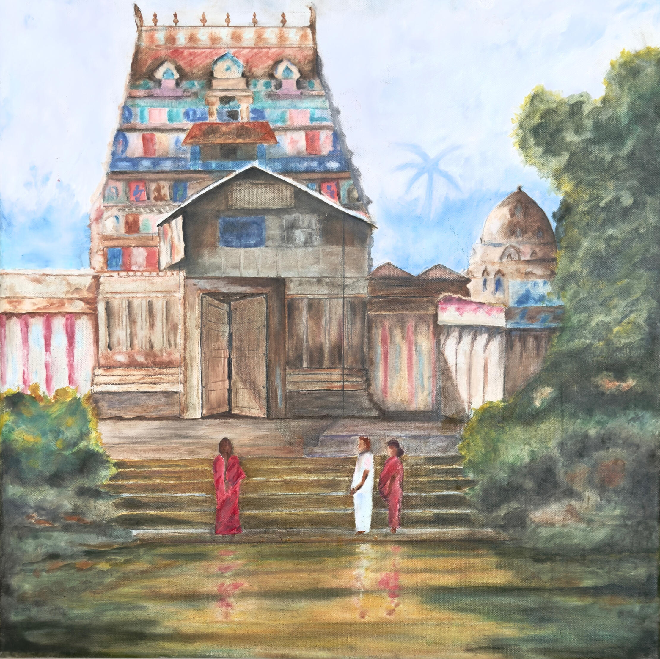 This painting captures a temple courtyard where tradition, light, and everyday devotion come together in a moment of calm presenceFaith woven into the rhythm of everyday life!Oil on Canvas 20x20 in