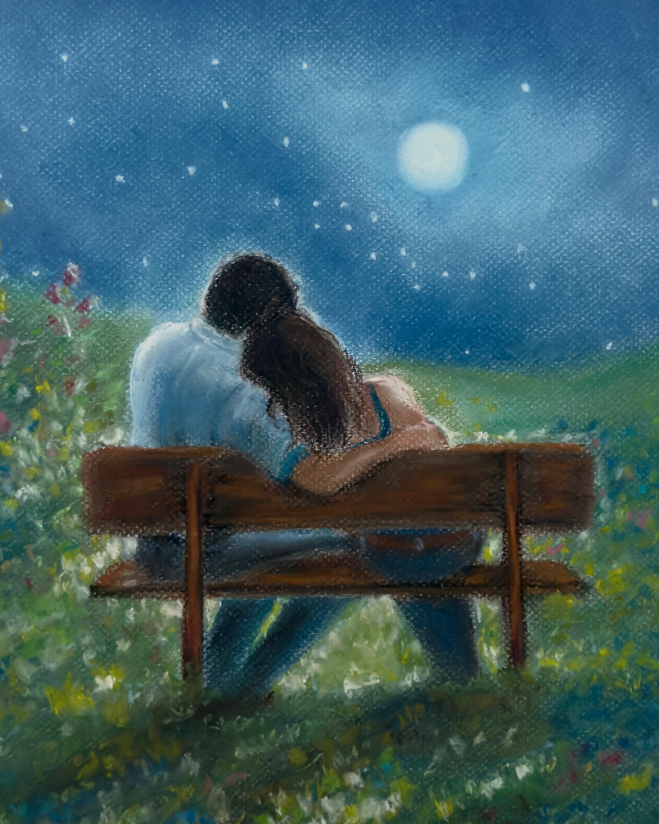 Set beneath a calm evening sky, this composition reflects the beauty of shared presence.Oil Pastel on Paper 11x14 in