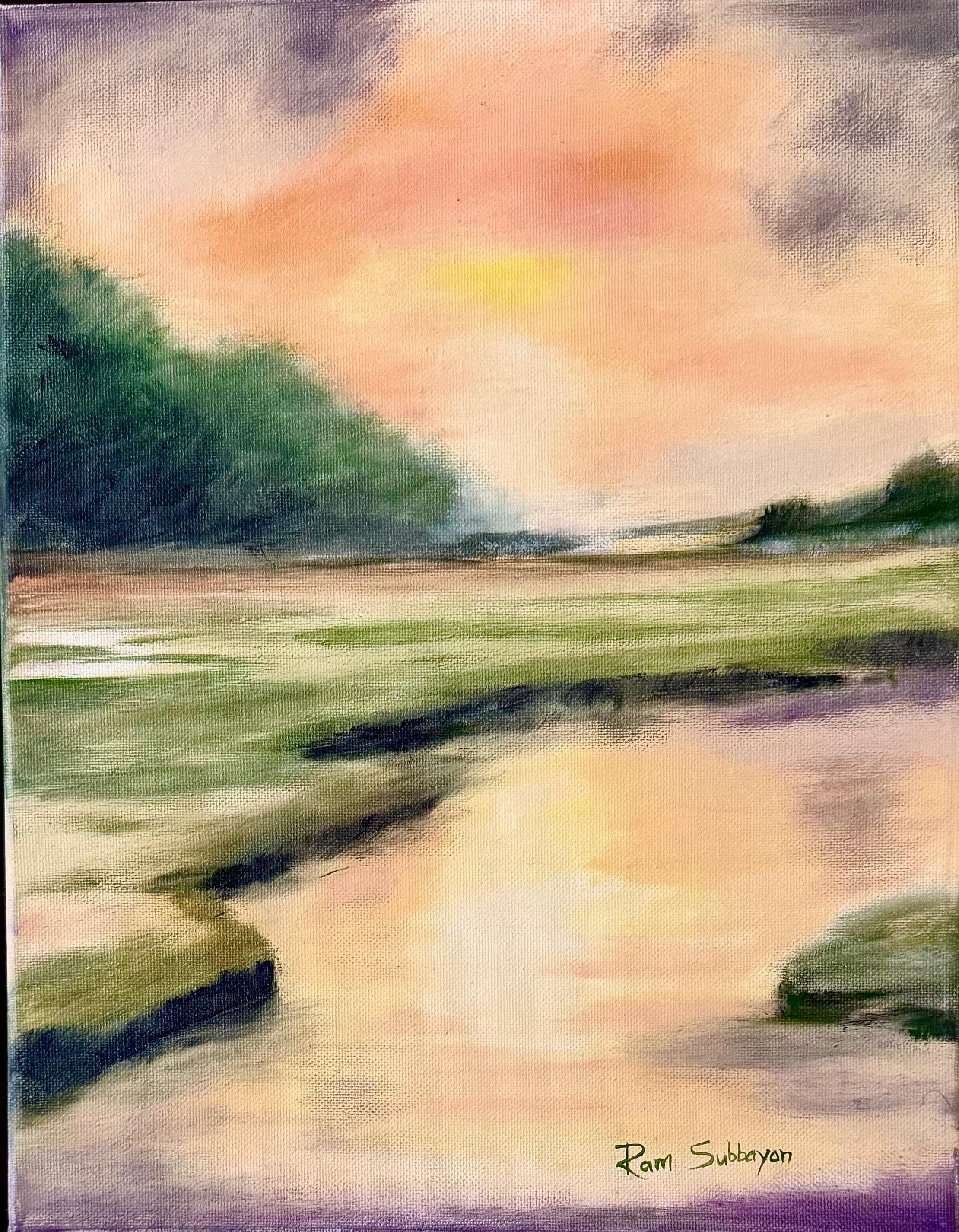 A landscape at dusk where soft colors of the sky reflect across still water. The scene captures the calm and curiosity of twilight as day slowly fades into evening.Oil on Canvas 11x14 in