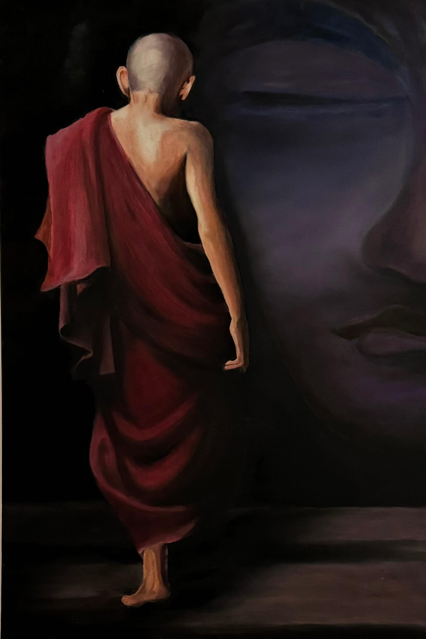 A monk walks forward, guided by an inward journey rather than a defined destination. The composition brings together movement and presence, where shadow, form, and fading imagery suggest a passage between the physical and the introspective.Through restrained tones and subtle transitions, the piece explores themes of awareness, detachment, and discipline—inviting the viewer to reflect on their own path within.Oil on Canvas 24x36 in