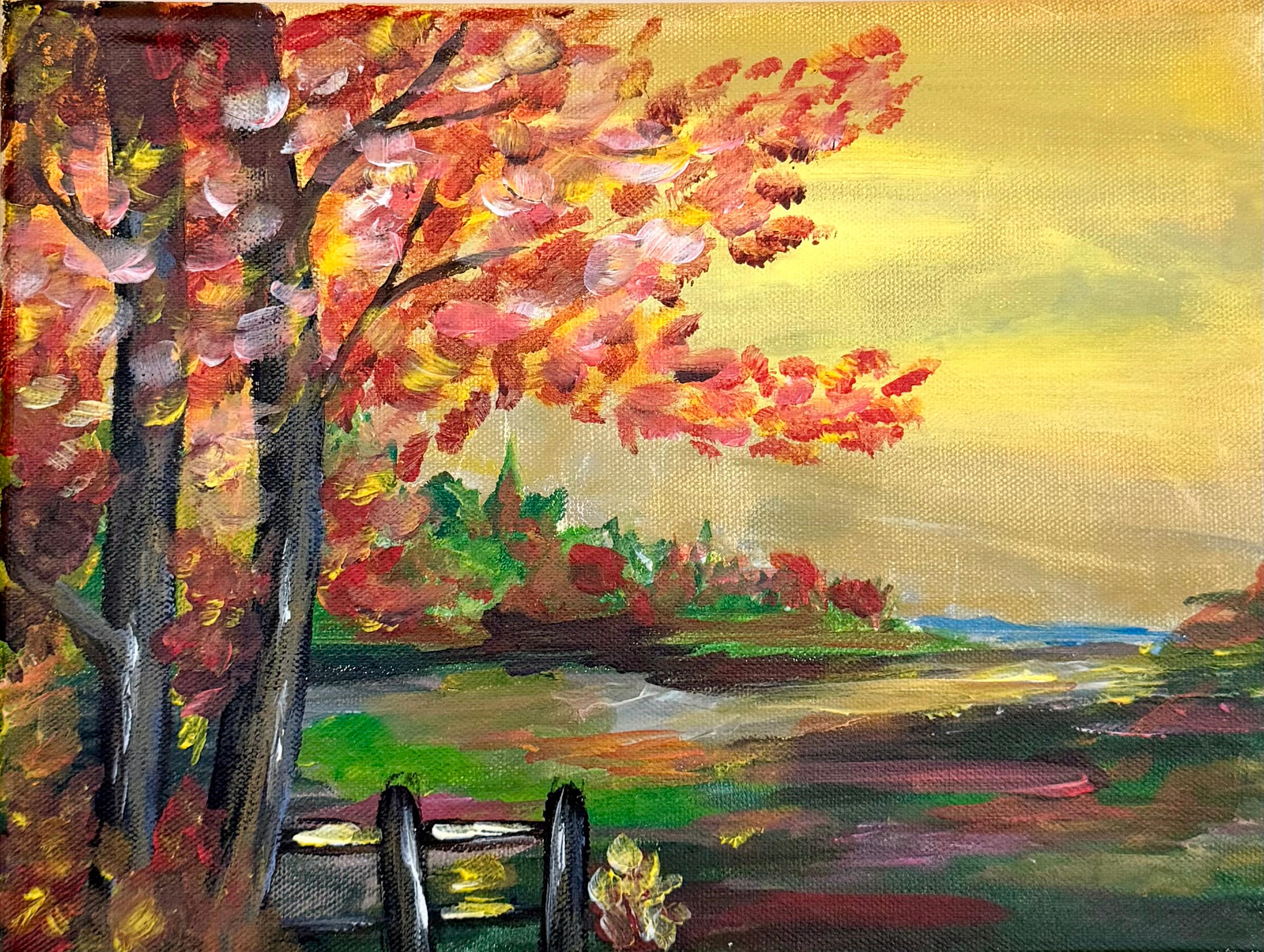 A gentle reawakening after years away from the canvas, this acrylic piece captures the warmth of rediscovery. Loose, expressive brushstrokes and soft autumn tones reflect both landscape and memory—where familiarity meets a renewed sense of creativity.This work marks a quiet but meaningful return to painting, embracing imperfection, light, and the joy of beginning again.Acrylic on Canvas 9x11 in