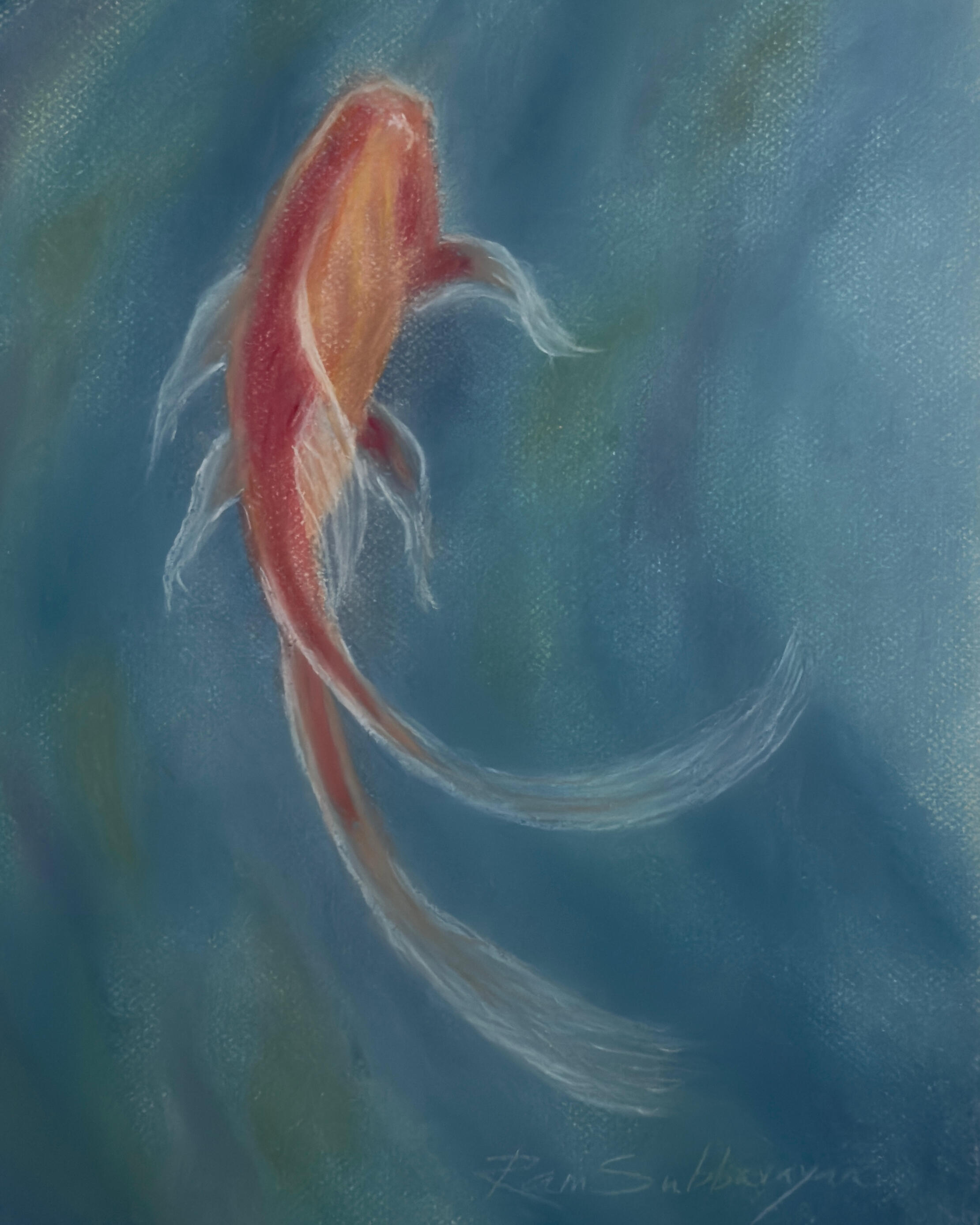 This oil pastel piece captures the gentle movement of fish beneath the water’s surface. Soft lines and flowing colors create a sense of quiet rhythm and harmony, reflecting the calm beauty of aquatic life.Oil Pastel on Paper 11x14 in