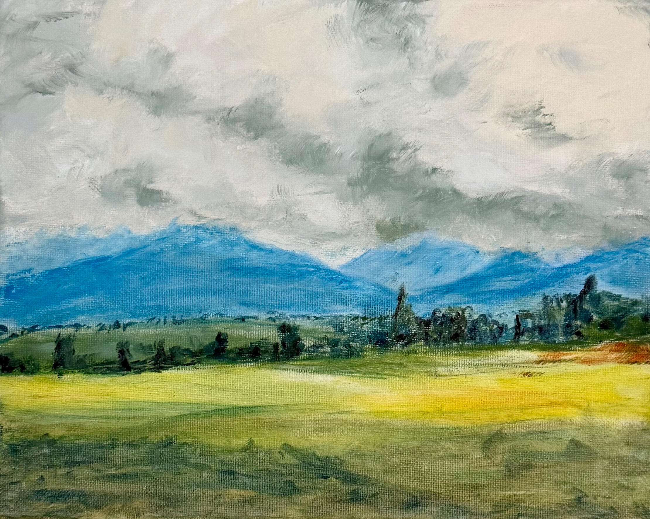 This landscape reflects a contemplative moment where land, sky, and distance merge. Soft brushwork and muted tones suggest open fields reaching toward distant hills under a layered sky.This piece marks my first exploration with oil paints —an important step in my evolving artistic journey, building on years of working with watercolors and sketching.Part of my Personal Collection.Oil on Canvas 9x11 in